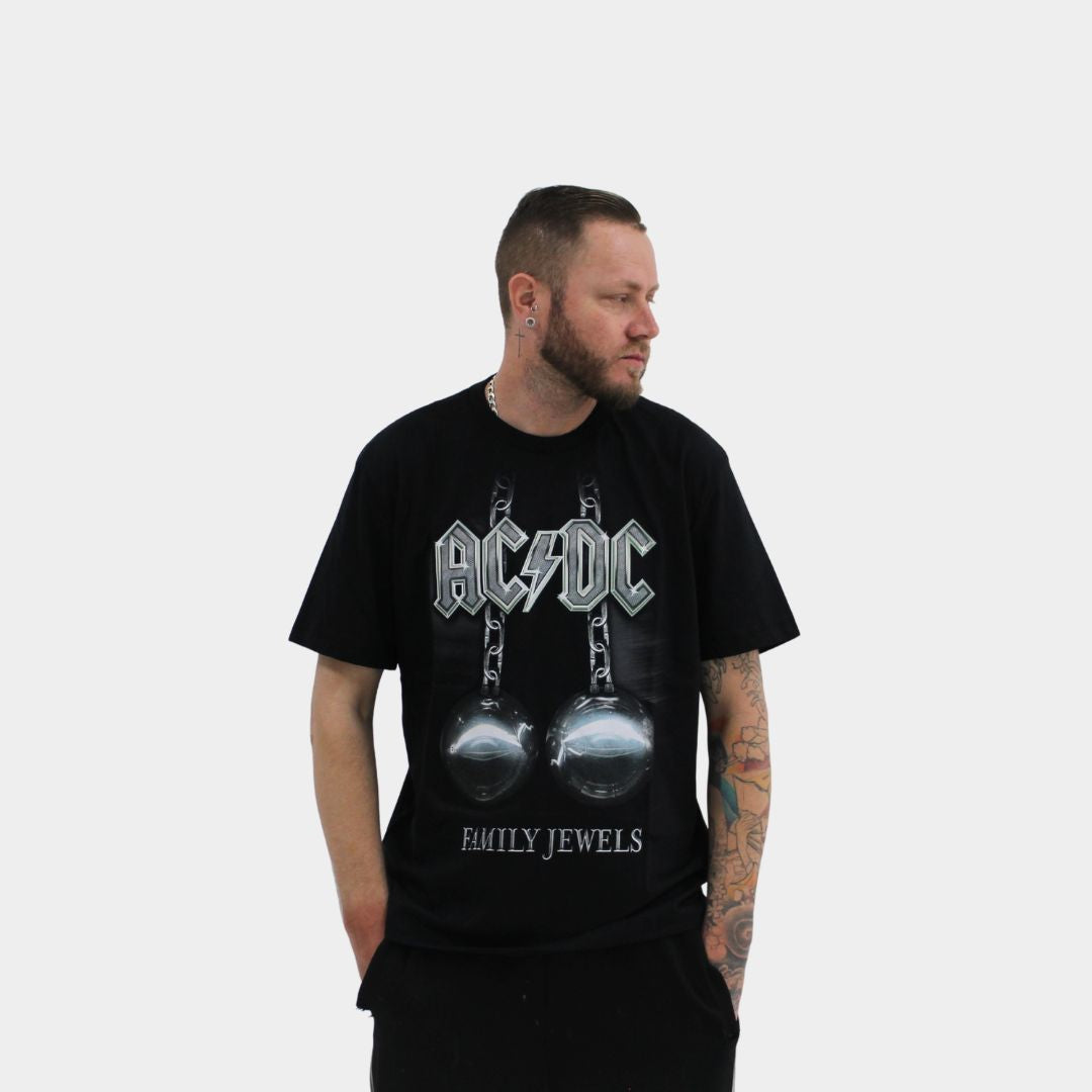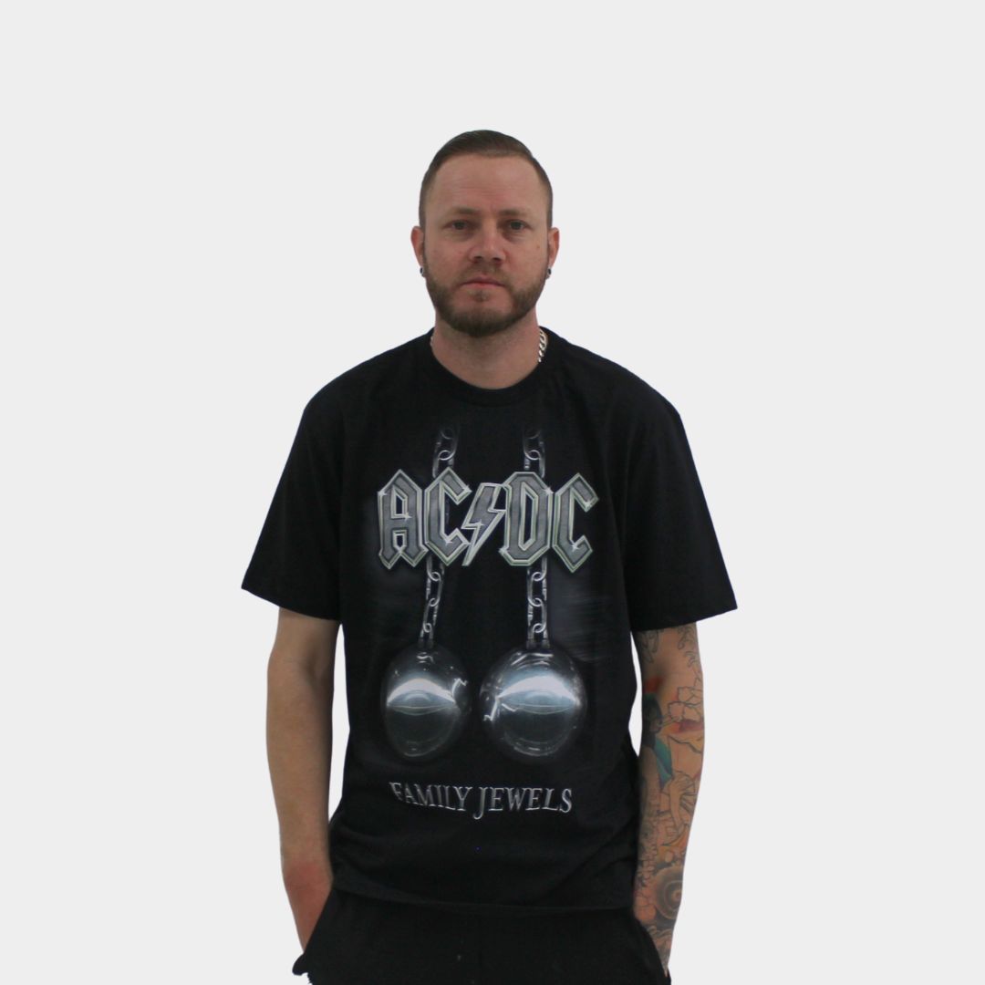 A estampa oficial traz o design marcante de Family Jewels, uma celebração visual da trajetória completa do AC/DC. Esta coletânea apresenta clipes históricos de músicas imortais como "Highway to Hell", "T.N.T.", "Back in Black" e "You Shook Me All Night Long", representando o legado completo da maior banda de rock australiana de todos os tempos.